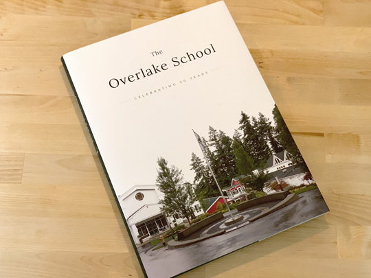 Another recent project was “The Overlake School: Celebrating 50 Years.” A keepsake book, it included every bell and whistle; dustjacket, special stamp, printed endsheets, special paper, foldout centerfold timeline. It was an honor to work on a project intended to serve as a time capsule for the future students and teachers of Overlake School.